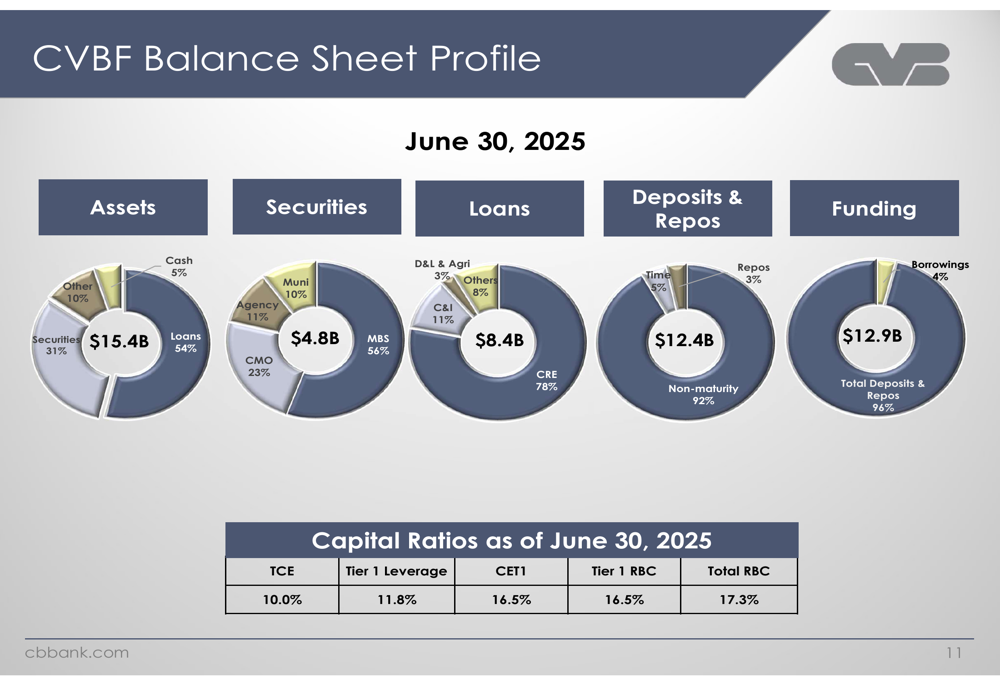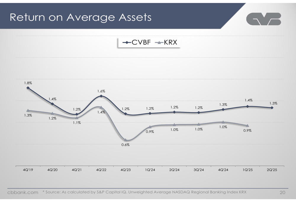 Essas comparações demonstram o desempenho superior da CVB Financial em relação aos pares bancários regionais, com ROAA em 1,3% no 2º tri de 2025 comparado à média do KRX de 0,9%. Esse desempenho superior destaca a eficácia do modelo de negócios do banco e seu foco estratégico.