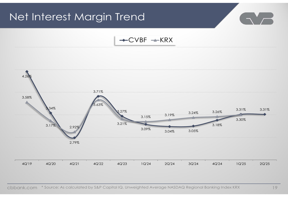 A CVB Financial consistentemente supera seus pares no Índice Bancário Regional da NASDAQ (KRX) em métricas-chave de desempenho. O gráfico a seguir ilustra a margem líquida de juros do banco em comparação com o índice KRX: