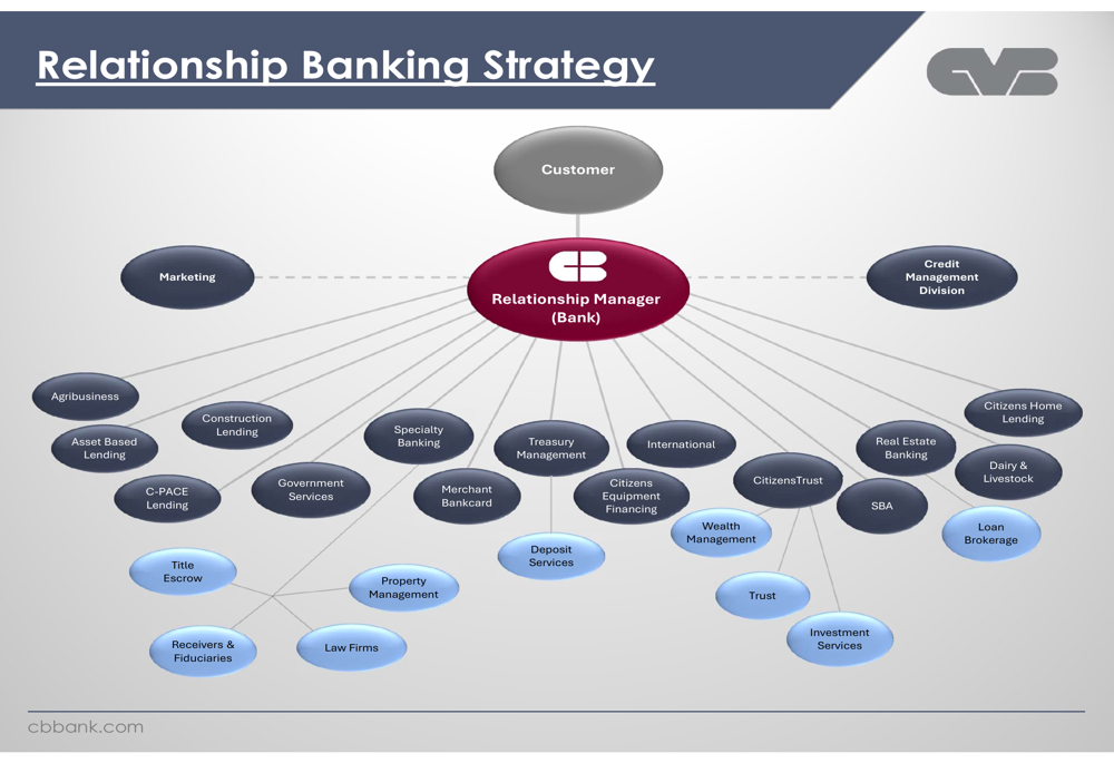 A estratégia de relacionamento bancário da CVB Financial é central para seu modelo de negócios, colocando o gerente de relacionamento no centro dos serviços abrangentes ao cliente. O diagrama a seguir ilustra esta abordagem: