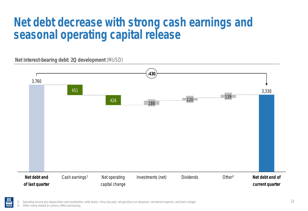 A forte geração de fluxo de caixa da Yara contribuiu para uma redução na dívida líquida com juros de US$ 3.760 milhões para US$ 3.330 milhões. Esta melhoria foi impulsionada por ganhos de caixa de US$ 451 milhões e uma mudança positiva no capital operacional líquido de US$ 426 milhões, parcialmente compensada por investimentos e pagamentos de dividendos.