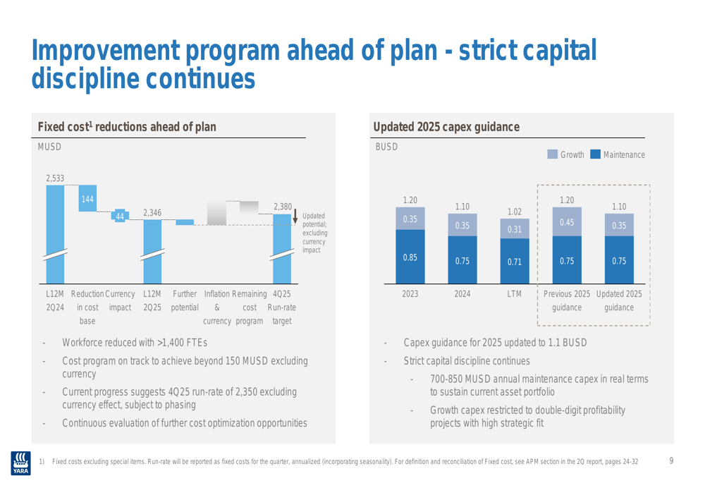 O programa de melhoria da Yara está adiantado, com reduções de custos fixos e otimização de capex contribuindo significativamente para o desempenho financeiro da empresa. A orientação de capex para 2025 foi atualizada para US$ 1,1 bilhão, refletindo disciplina rigorosa de capital e foco em projetos de alto retorno.