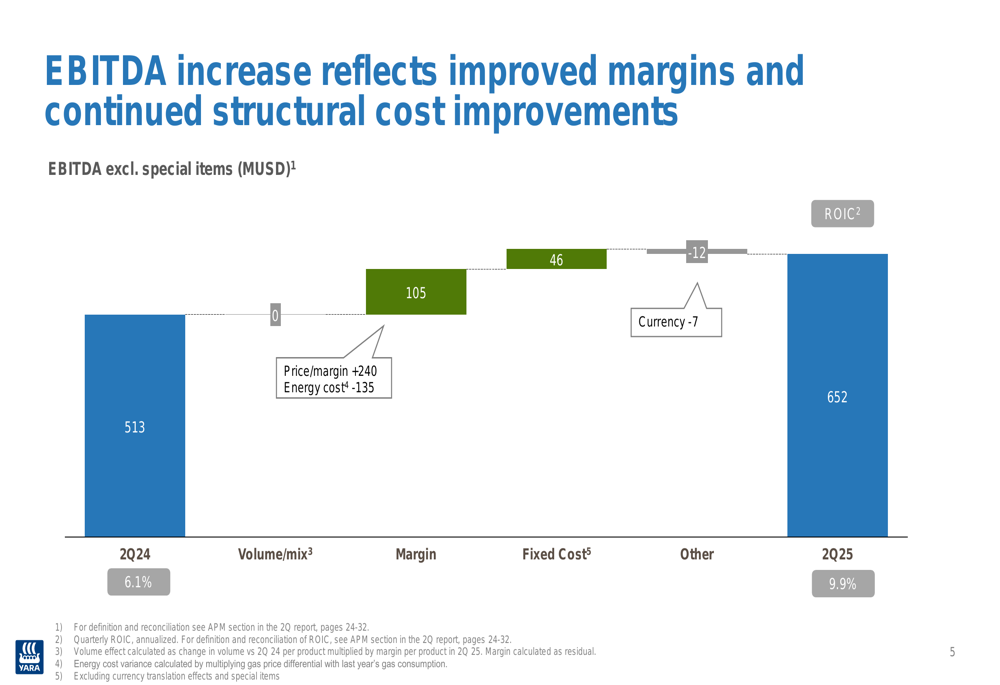 A Yara reportou um EBITDA, excluindo itens especiais, de US$ 652 milhões para o 2º tri de 2025, representando um aumento de 27% em relação aos US$ 513 milhões no mesmo período do ano passado. Esta melhoria foi principalmente impulsionada pela expansão das margens, contribuindo com US$ 105 milhões para o crescimento do EBITDA, juntamente com reduções de custos fixos de US$ 46 milhões.