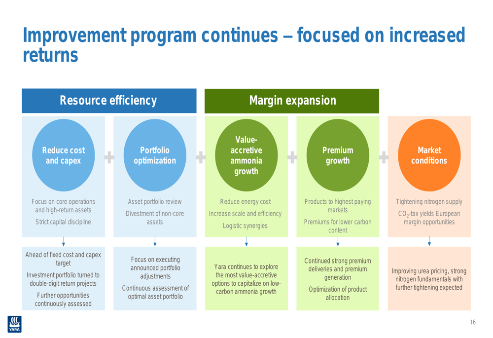A empresa continua focada em seu programa de melhoria, visando aumentar os retornos através da eficiência de recursos, expansão de margens, otimização de portfólio e condições favoráveis de mercado. A Yara pretende reduzir os custos fixos para uma meta de taxa de execução de US$ 2.380 milhões até o 4º trimestre de 2025.