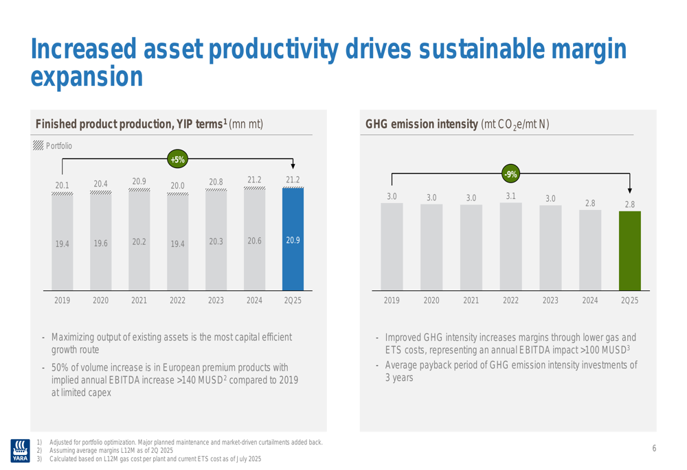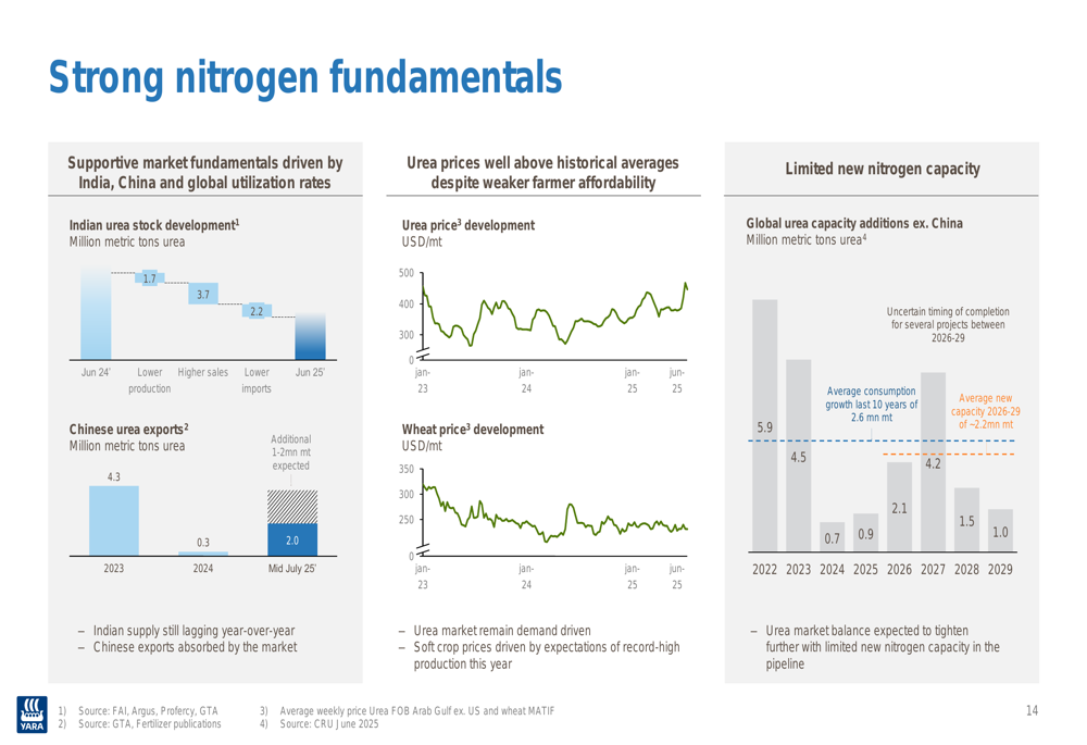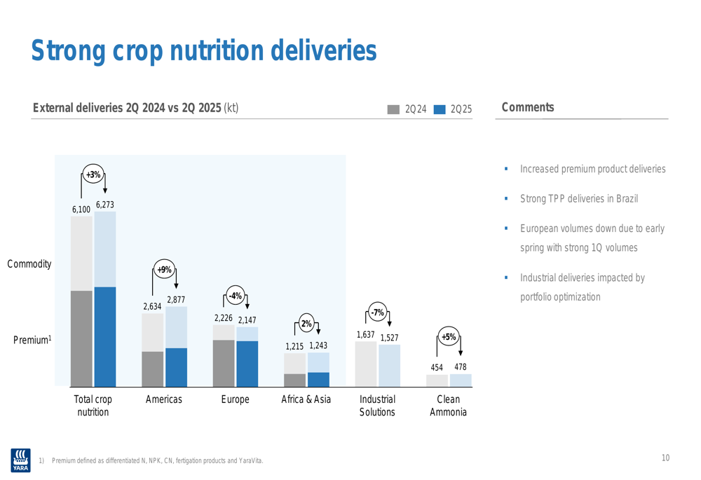 Apesar da diminuição trimestral nos volumes europeus, as entregas europeias de temporada completa da Yara aumentaram 5%, superando o crescimento de 1% da indústria de fertilizantes em geral. A empresa manteve uma carteira de pedidos europeia saudável de aproximadamente dois meses entrando no 3º tri de 2025.