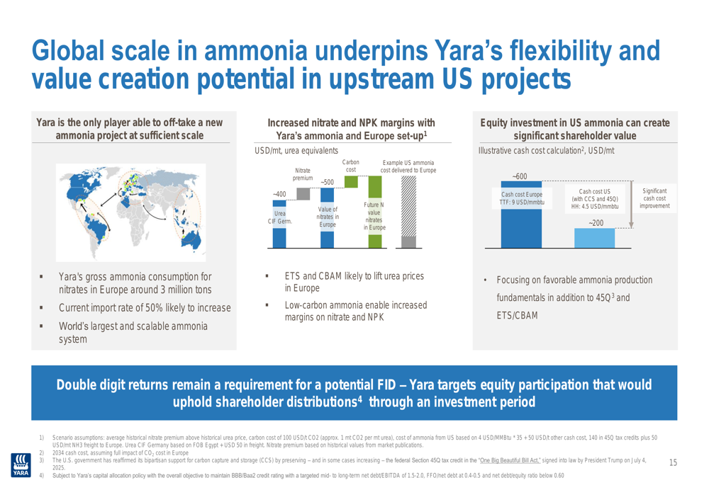 A escala global da Yara na produção e fornecimento de amônia proporciona uma flexibilidade única no mercado. A empresa é a única capaz de absorver um novo projeto de amônia em escala suficiente, posicionando-a bem para potenciais investimentos estratégicos, particularmente no mercado dos EUA.
