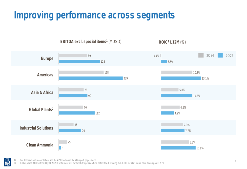 O desempenho financeiro da Yara melhorou na maioria dos segmentos, com resultados particularmente fortes nas Américas, onde o EBITDA aumentou de US$ 168 milhões para US$ 239 milhões, e na Europa, onde o EBITDA subiu de US$ 89 milhões para US$ 128 milhões.