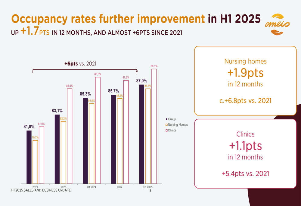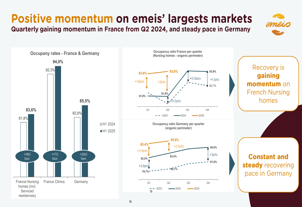 França e Alemanha, os maiores mercados da Emeis, ambos mostraram impulso positivo nas taxas de ocupação, com as casas de repouso na França aumentando de 81,8% para 83,6% e as clínicas de 92,3% para 94,0%. A Alemanha viu uma melhoria de 82,9% para 85,5%.