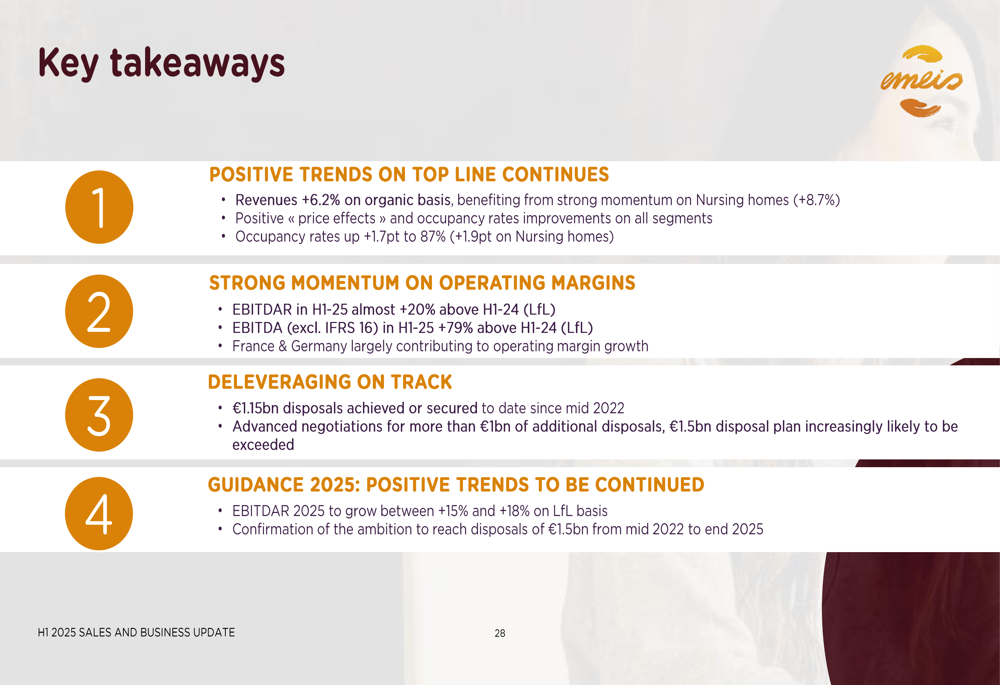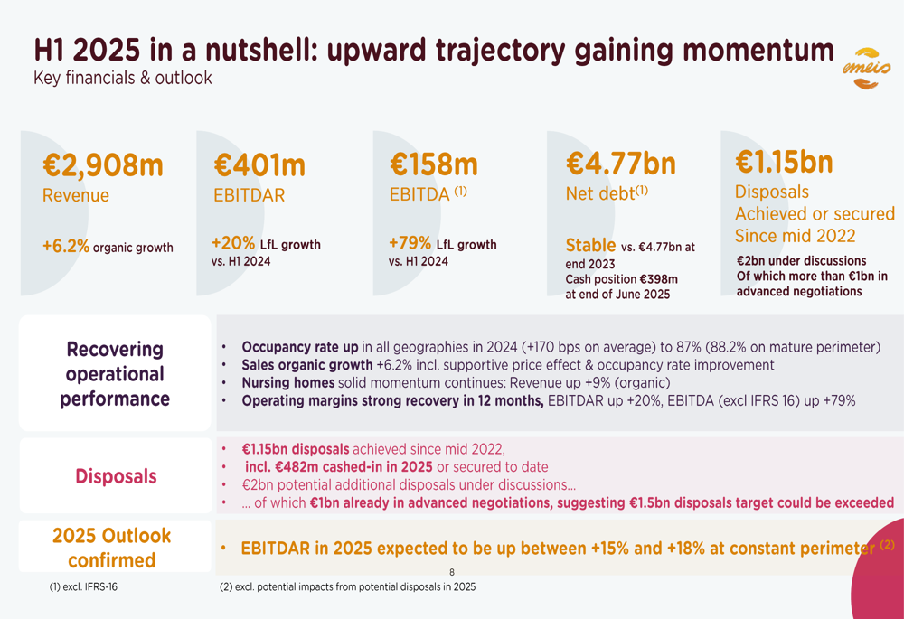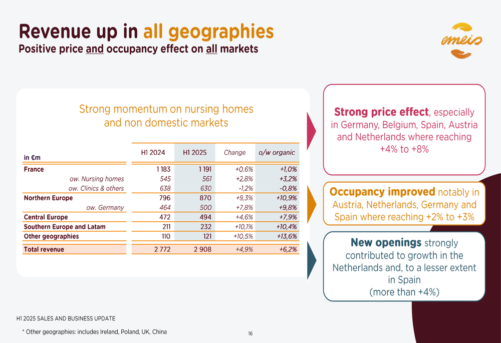 A Emeis reportou crescimento de receita em todas as regiões geográficas, com desempenho particularmente forte no Norte da Europa, que viu um aumento de € 796 milhões no primeiro semestre de 2024 para € 870 milhões no primeiro semestre de 2025. O segmento de casas de repouso da empresa, que representa 65% da receita total, cresceu 8,6% organicamente.