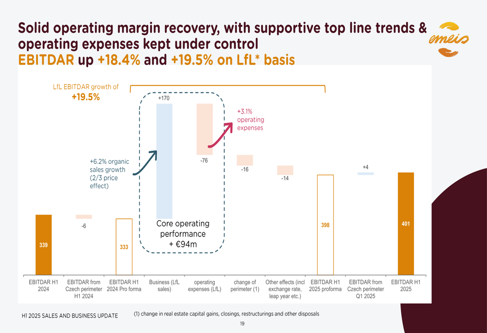 A Emeis reportou receita de € 2,91 bilhões para o primeiro semestre de 2025, representando um crescimento orgânico de 6,2% em comparação ao mesmo período do ano passado. O EBITDAR (lucros antes de juros, impostos, depreciação, amortização e aluguel) da empresa alcançou € 401 milhões, um aumento de 20% em base comparável, enquanto o EBITDA saltou 79% para € 158 milhões.