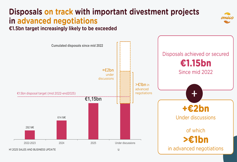 Somente no primeiro semestre de 2025, a Emeis completou € 482 milhões em desinvestimentos, incluindo € 346 milhões em ativos imobiliários e € 136 milhões em desinvestimentos operacionais. Os desinvestimentos imobiliários foram geograficamente diversos, com 45% na França, 37% nos Países Baixos e o restante distribuído por outros países europeus.