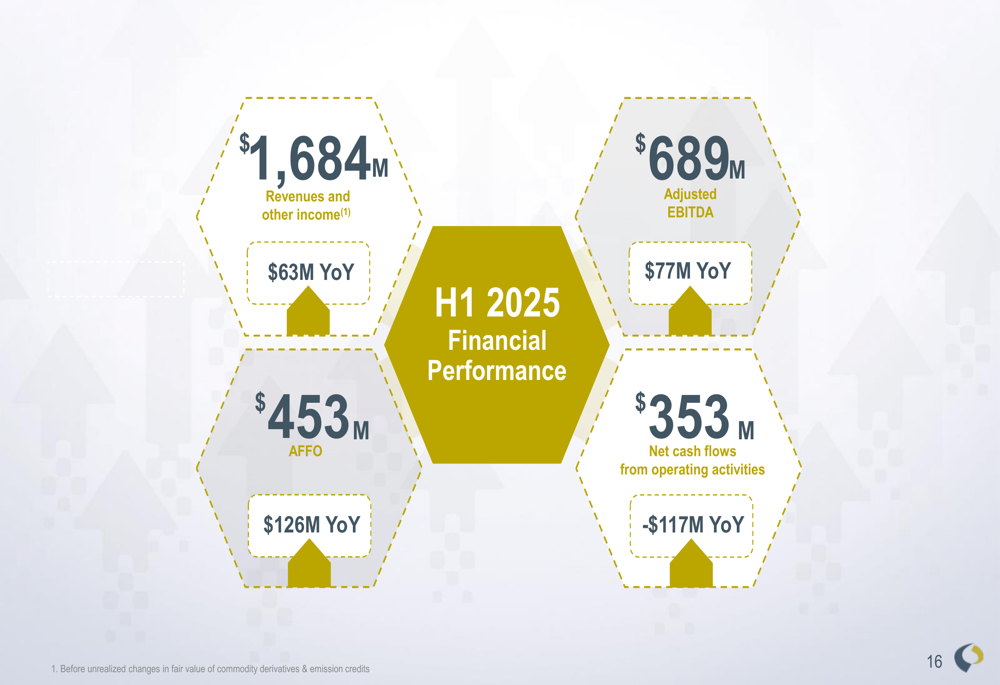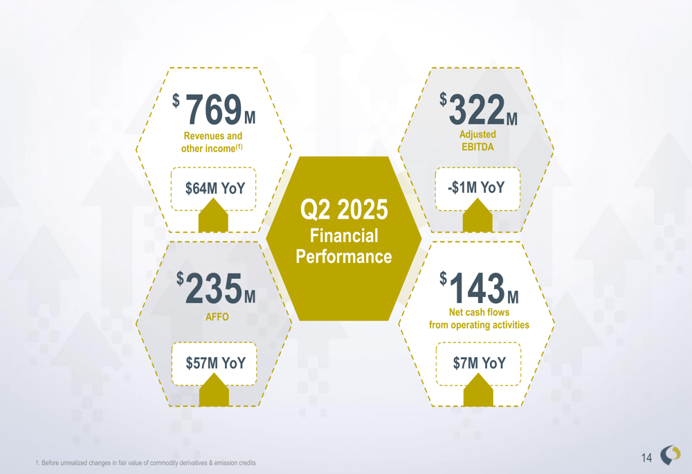 A Capital Power reportou resultados financeiros estáveis para o 2º tri de 2025, com o EBITDA ajustado mantendo-se estável em US$ 322 milhões na comparação anual, enquanto os fundos ajustados de operações (AFFO) aumentaram significativamente em US$ 57 milhões, alcançando US$ 235 milhões. O fluxo de caixa líquido das atividades operacionais mostrou uma melhora modesta, subindo US$ 7 milhões para US$ 143 milhões em comparação com o mesmo período do ano anterior.