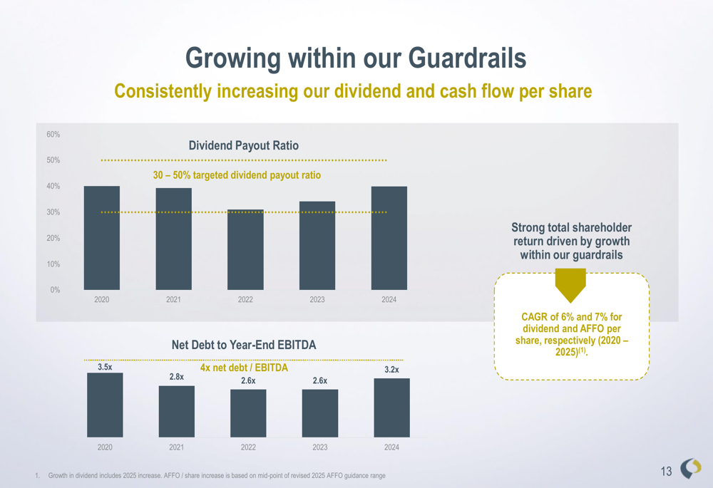 A empresa mantém uma abordagem disciplinada para o crescimento dentro de suas salvaguardas financeiras, visando uma taxa de distribuição de dividendos de 30-50% e mantendo uma relação dívida líquida/EBITDA de 3,2x em 2024. A Capital Power entregou uma taxa composta de crescimento anual de 6% para dividendos e 7% para AFFO por ação de 2020 a 2025.