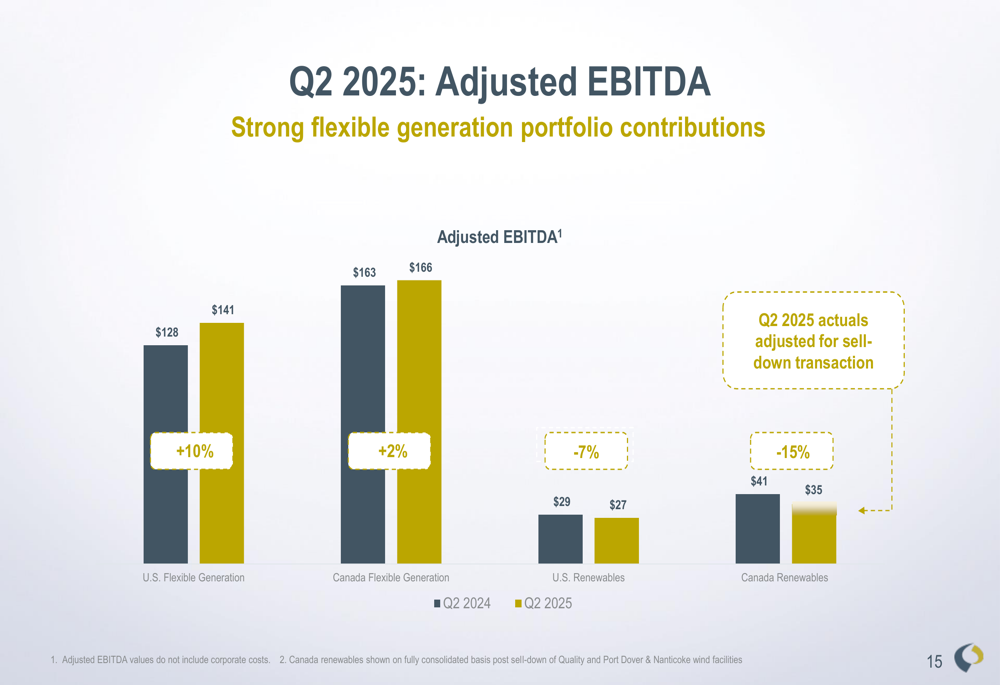 Uma análise detalhada do EBITDA ajustado por segmento revela desempenhos variados em todo o portfólio da empresa. A Geração Flexível dos EUA mostrou o crescimento mais forte, com um aumento anual de 10% para US$ 141 milhões no 2º tri de 2025. A Geração Flexível Canadense registrou um crescimento modesto de 2%, alcançando US$ 166 milhões. No entanto, ambos os segmentos renováveis experimentaram declínios, com Renováveis dos EUA caindo 7% para US$ 27 milhões e Renováveis Canadenses caindo 15% para US$ 35 milhões.