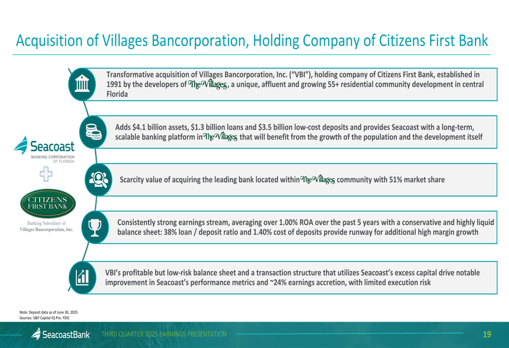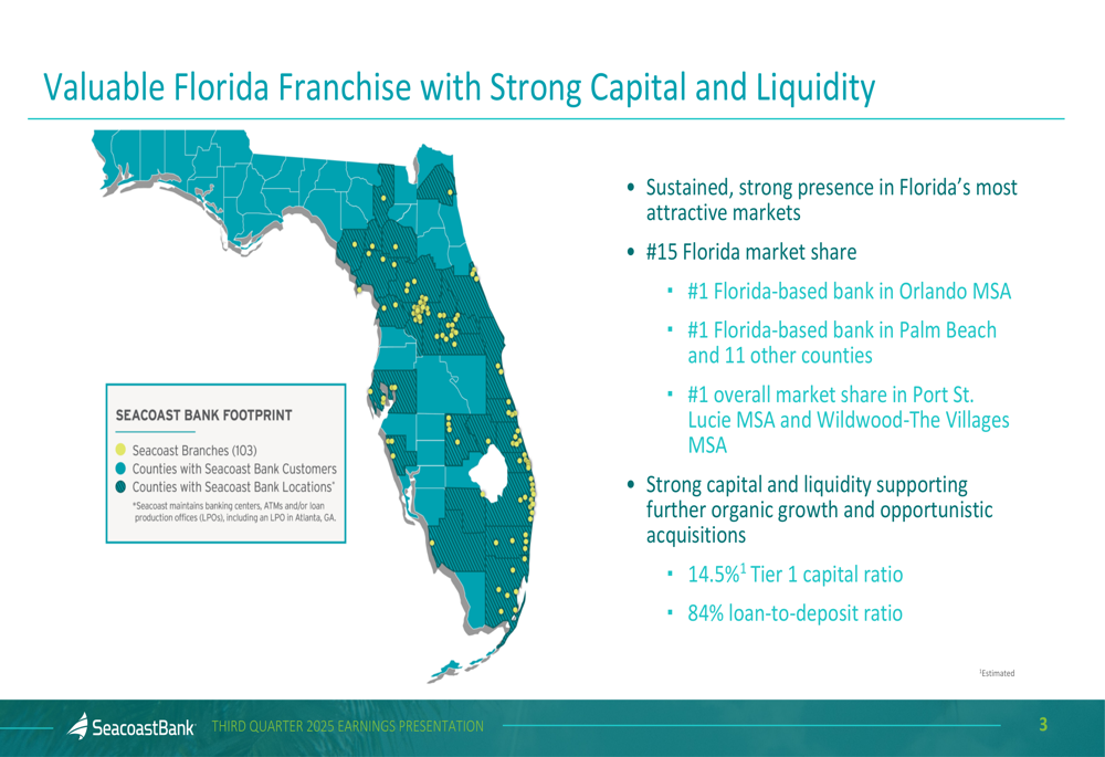 Mais notavelmente, em 1º de outubro de 2025, a Seacoast concluiu a aquisição da Villages Bancorporation, Inc., adicionando 19 agências e aproximadamente US$ 4 bilhões em ativos. Esta aquisição transformadora proporciona à Seacoast uma participação dominante de 51% no mercado de The Villages, uma comunidade residencial próspera e em crescimento para pessoas acima de 55 anos no centro da Flórida.