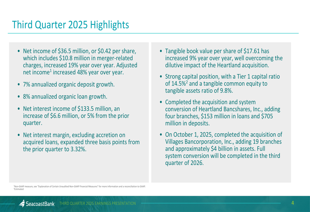 A Seacoast reportou lucro líquido de US$ 36,5 milhões ou US$ 0,42 por ação em base GAAP, que incluiu US$ 10,8 milhões em despesas relacionadas a fusões. Em base ajustada, o lucro atingiu US$ 0,52 por ação, superando significativamente as expectativas dos analistas.