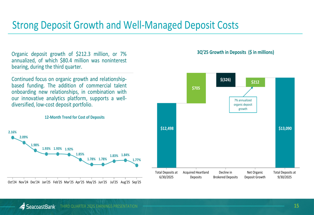 O pipeline de empréstimos do banco aumentou 32% para US$ 1,2 bilhão, indicando forte impulso entrando no quarto trimestre de 2025. Este robusto pipeline, combinado com as aquisições estratégicas concluídas durante o trimestre, posiciona a Seacoast para crescimento contínuo em 2026 e além.