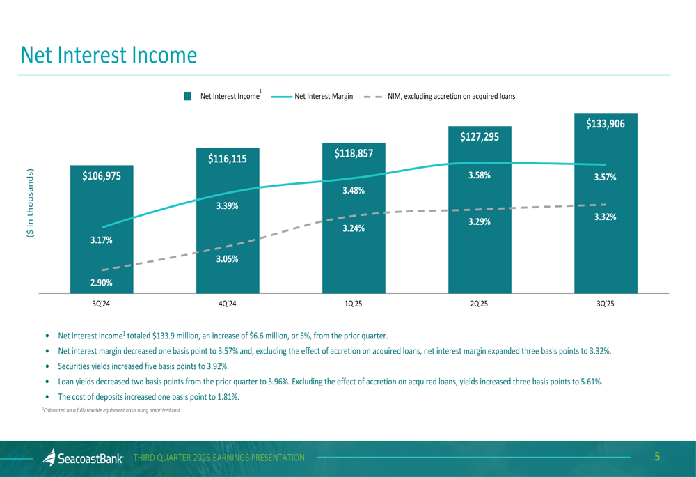A receita líquida de juros da Seacoast tem mostrado crescimento consistente nos últimos cinco trimestres, atingindo US$ 133,9 milhões no 3º tri de 2025, um aumento de 5% em relação ao trimestre anterior. A margem líquida de juros, excluindo acréscimos, expandiu três pontos base para 3,32%, refletindo a capacidade do banco de gerenciar efetivamente os custos de financiamento.