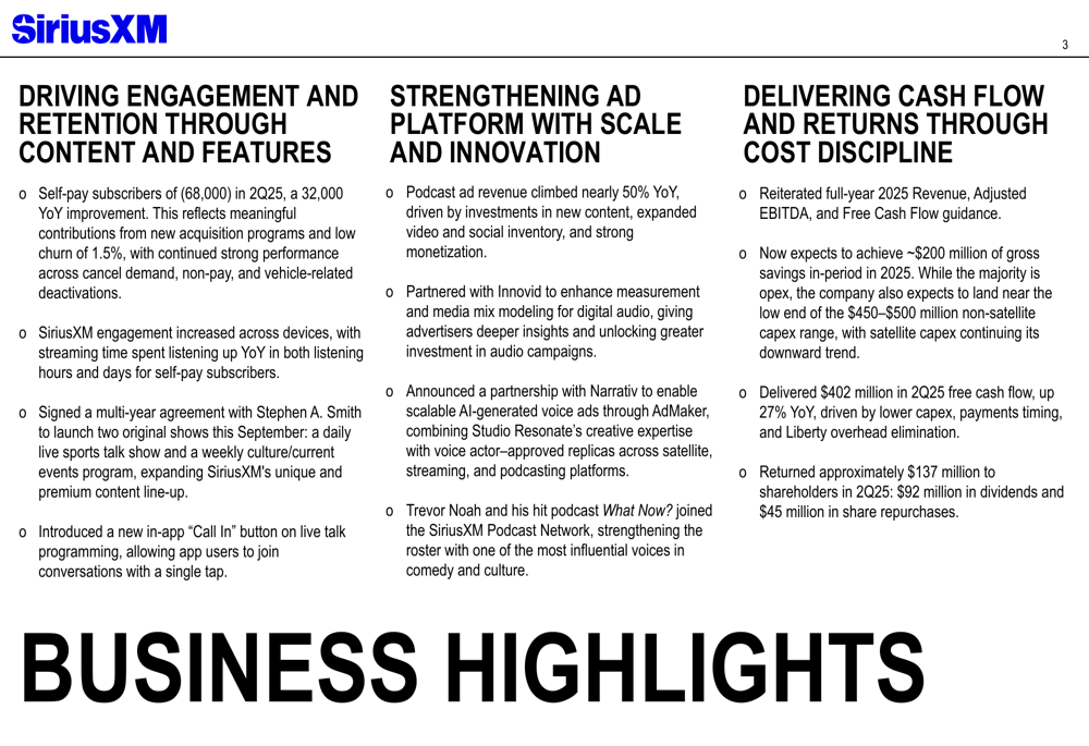 As principais iniciativas estratégicas incluíram a assinatura de um acordo plurianual com Stephen A. Smith, a introdução de um novo botão "Call In" para melhorar a interação dos ouvintes, e a adição de Trevor Noah à Rede de Podcasts SiriusXM. A empresa também lançou novos canais e expandiu sua cobertura esportiva em MLB, NBA, NHL e Fórmula 1.