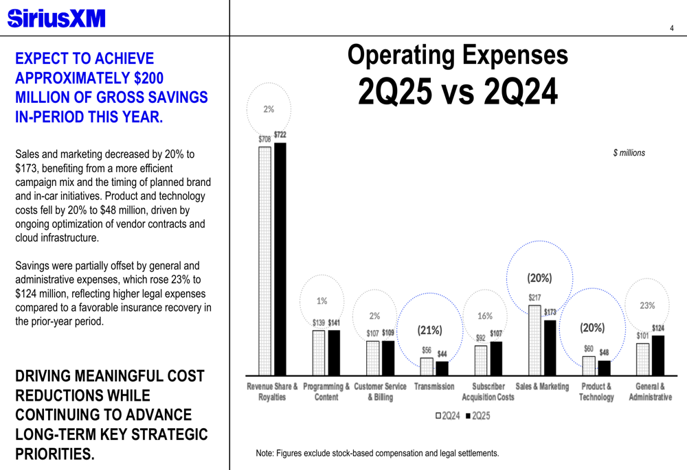 Um fator-chave para o melhor desempenho do fluxo de caixa da SiriusXM tem sido sua agressiva estratégia de gestão de custos. A empresa reportou reduções significativas nas despesas operacionais, com custos de vendas e marketing reduzidos em 20% para US$ 173 milhões e despesas com produtos e tecnologia reduzidas em 20% para US$ 48 milhões. Essas economias foram parcialmente compensadas por um aumento de 23% nas despesas gerais e administrativas, que subiram para US$ 124 milhões.