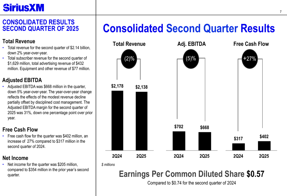 A SiriusXM reportou uma receita total de US$ 2,14 bilhões para o 2º tri 2025, representando uma queda de 2% em relação ao ano anterior. Apesar desta redução na receita, a empresa entregou US$ 402 milhões em fluxo de caixa livre, um aumento substancial de 27% em comparação com o mesmo período do ano passado. O EBITDA ajustado foi de US$ 668 milhões, uma queda de 5% em relação ao ano anterior, enquanto o lucro líquido alcançou US$ 205 milhões, com lucro por ação diluído de US$ 0,57 (comparado a US$ 0,74 no 2º tri 2024).