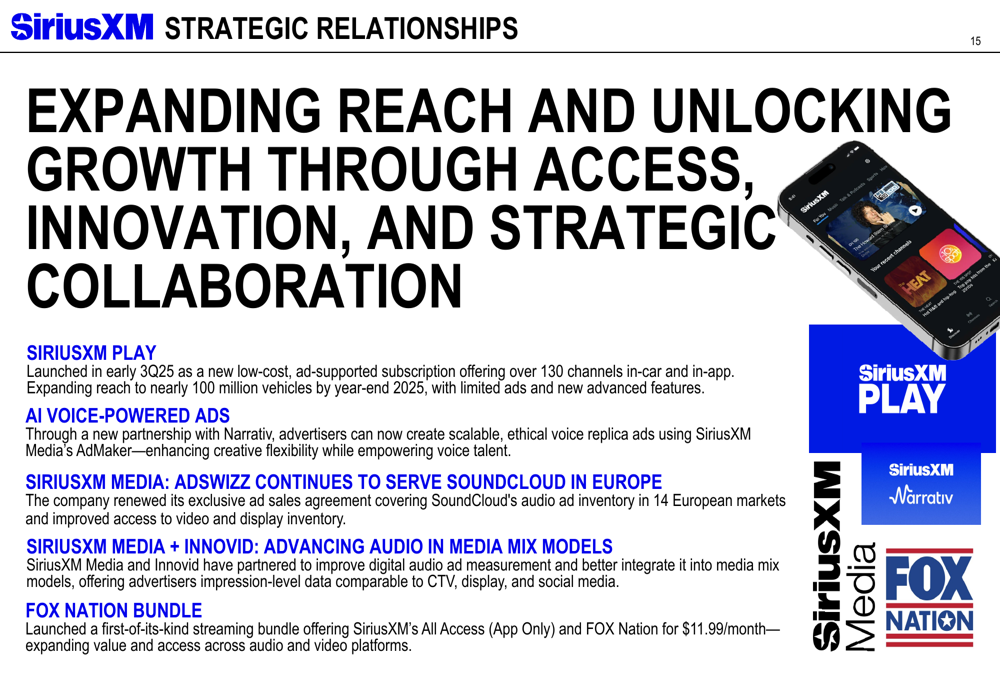 No fronte tecnológico e de parcerias, a SiriusXM introduziu o "SiriusXM Play", uma nova oferta de assinatura com suporte de anúncios, enquanto também formava relações estratégicas com a Narrativ para anúncios éticos de réplica de voz e com a Innovid para melhorar o áudio em modelos de mix de mídia. Adicionalmente, a empresa anunciou parcerias com SoundCloud Adswizz e FOX Nation para expandir suas ofertas de conteúdo e alcance.