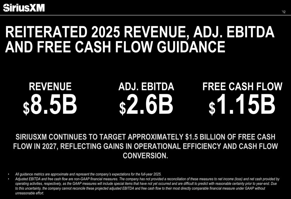 A SiriusXM reiterou suas orientações para o ano fiscal de 2025, projetando receita de US$ 8,5 bilhões, EBITDA ajustado de US$ 2,6 bilhões e fluxo de caixa livre de US$ 1,15 bilhão. Olhando mais adiante, a empresa mantém sua meta de aproximadamente US$ 1,5 bilhão em fluxo de caixa livre até 2027, apoiada pela redução de despesas de capital e contínua disciplina de custos.