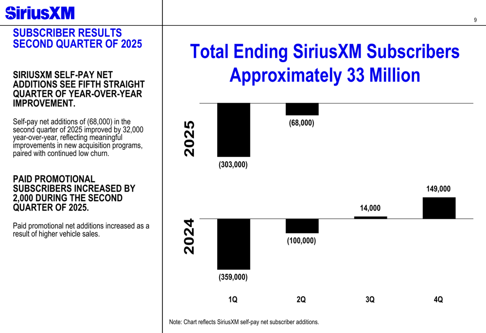 No que diz respeito aos assinantes, a SiriusXM reportou perdas líquidas de 68.000 assinantes autopagantes no 2º tri 2025, o que representa uma melhoria de 32.000 assinantes em comparação com o mesmo trimestre do ano anterior. Este é o quinto trimestre consecutivo de melhoria ano a ano nas tendências de assinantes, sugerindo que as estratégias de retenção da empresa estão ganhando força.