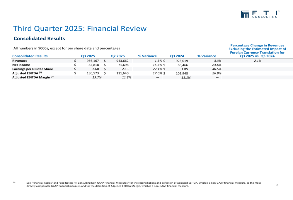 A FTI Consulting reportou receitas de US$ 956,2 milhões no 3º tri de 2025, representando um aumento de 3,3% em relação ao ano anterior e um crescimento de 1,3% em relação ao trimestre anterior. Mais impressionante ainda, a empresa alcançou um crescimento substancial no resultado final, com lucro líquido de US$ 82,8 milhões, um aumento de 24,6% em relação ao 3º tri de 2024 e 15,5% em relação ao 2º tri de 2025.