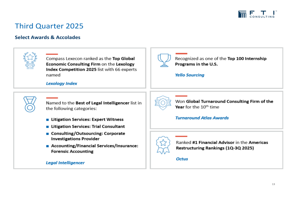Durante o trimestre, a FTI Consulting recebeu vários reconhecimentos notáveis que reforçam sua posição de liderança no mercado. Esses reconhecimentos abrangem várias áreas de prática e destacam a expertise e reputação da empresa no setor de consultoria.
