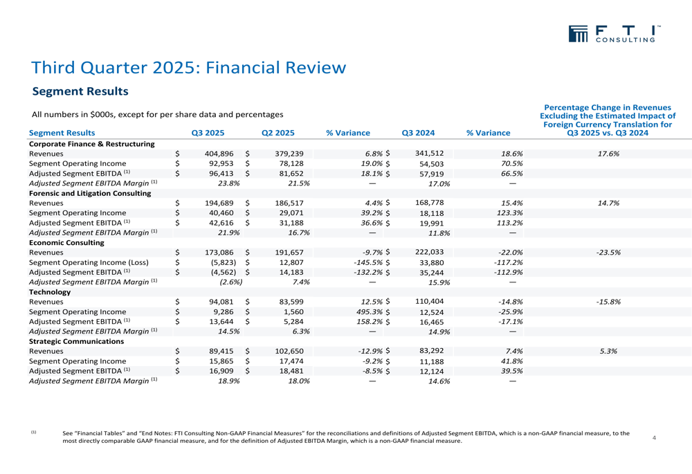 O desempenho da consultoria demonstrou resiliência em um ambiente econômico desafiador, com seu modelo de negócios diversificado permitindo que fortes resultados em serviços de reestruturação e forenses compensassem a fraqueza em outros segmentos. Os resultados deste trimestre continuam a refletir o posicionamento estratégico da FTI como líder em serviços de consultoria especializada.