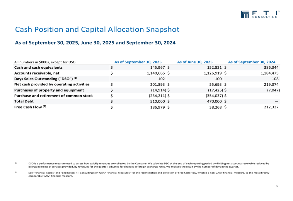 O balanço patrimonial e a estratégia de alocação de capital da FTI Consulting mostraram mudanças significativas em comparação com o ano anterior. Caixa e equivalentes de caixa somavam US$ 146,0 milhões em 30 de setembro de 2025, uma queda substancial em relação aos US$ 386,3 milhões de um ano antes. Essa redução reflete o programa ativo de recompra de ações da empresa, com US$ 234,2 milhões gastos na recompra de ações no acumulado do ano.