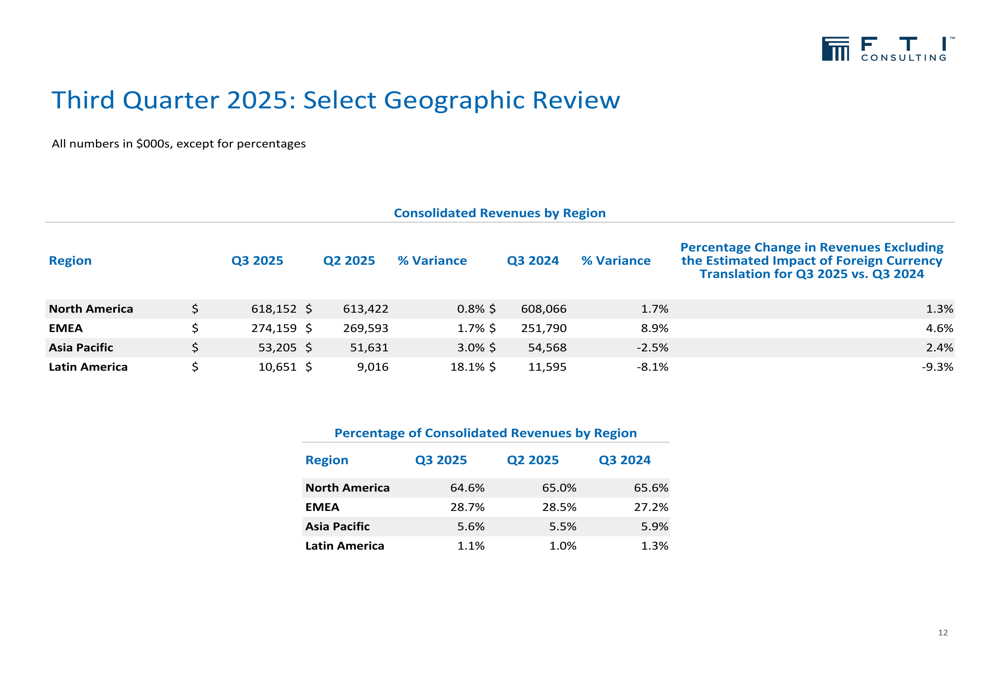 O desempenho geográfico da FTI Consulting revelou força na EMEA (Europa, Oriente Médio e África) e estabilidade na América do Norte, enquanto Ásia-Pacífico e América Latina experimentaram declínios.