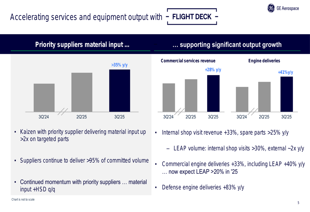 As melhorias Kaizen dobraram a entrada de materiais, enquanto os fornecedores agora estão entregando mais de 95% do volume comprometido. Isso permitiu um aumento de 33% na receita de visitas internas às oficinas e mais de 25% de crescimento em peças de reposição. As entregas de motores comerciais aumentaram 33% em relação ao ano anterior, incluindo um aumento de 40% nas entregas de motores LEAP, com o crescimento do LEAP esperado para exceder 20% para o ano completo de 2025.