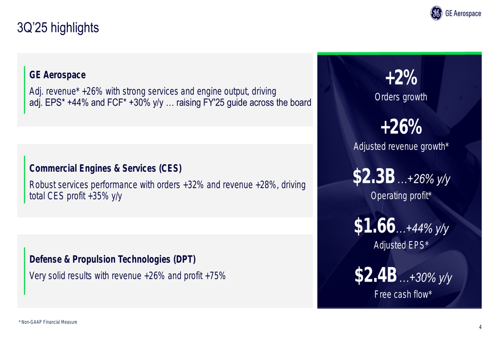 O lucro operacional está projetado para atingir US$ 8,65-US$ 8,85 bilhões, enquanto a orientação de LPA ajustado foi elevada para US$ 6,00-US$ 6,20. O fluxo de caixa livre deve ser de US$ 7,1-US$ 7,3 bilhões para o ano completo. Projeta-se que o segmento de Motores e Serviços Comerciais entregue um crescimento de receita na casa dos altos dígitos com lucro operacional de US$ 8,7-US$ 8,8 bilhões. O segmento de Tecnologias de Defesa e Propulsão deve alcançar um crescimento de receita na casa dos vinte e poucos por cento com lucro operacional de US$ 1,5-US$ 1,6 bilhões.