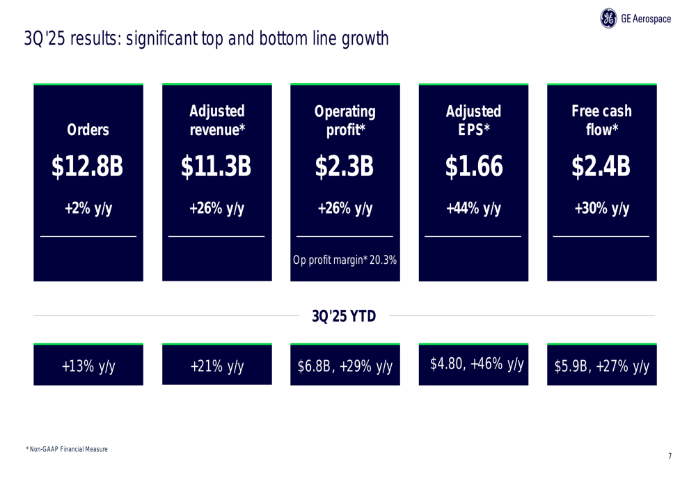 A GE Aerospace reportou resultados financeiros impressionantes para o 3º tri de 2025, com crescimento substancial em todas as métricas-chave. A empresa alcançou US$ 11,3 bilhões em receita ajustada, representando um aumento de 26% em comparação com o mesmo período do ano passado.