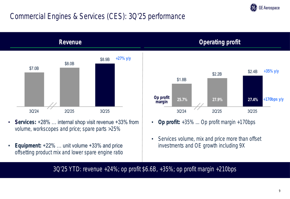 O segmento de Motores e Serviços Comerciais (CES), que representa a maior parte dos negócios da GE Aerospace, entregou resultados excepcionais com receita de US$ 8,9 bilhões, um aumento de 27% em relação ao ano anterior. O lucro operacional deste segmento aumentou 35% para US$ 2,4 bilhões, com margens expandindo 170 pontos base para 27,4%.