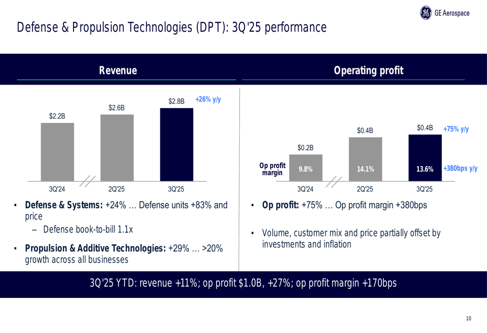 O segmento de Tecnologias de Defesa e Propulsão (DPT) também teve um forte desempenho, com receita aumentando 26% para US$ 2,8 bilhões e lucro operacional disparando 75% para US$ 0,4 bilhões. A margem de lucro operacional expandiu significativamente em 380 pontos base para 13,6%.