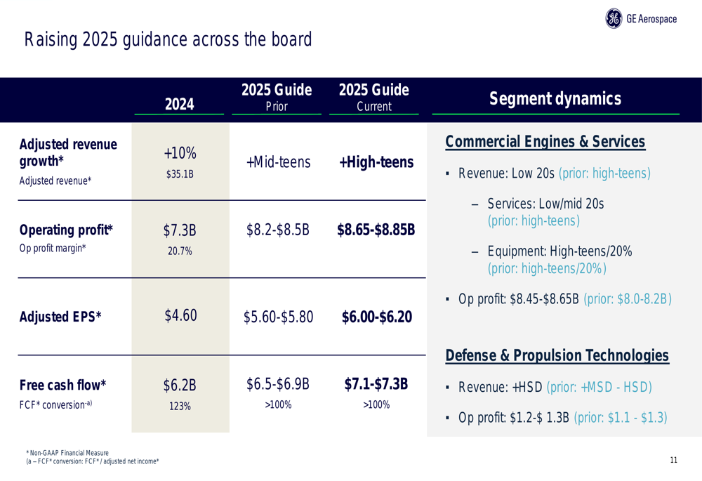 Com base no forte desempenho acumulado do ano, a GE Aerospace elevou suas orientações para o ano completo de 2025 em todas as métricas. A empresa agora espera um crescimento de receita ajustada na casa dos altos dígitos (high-teens), acima de sua previsão anterior de dígitos médios (mid-teens).