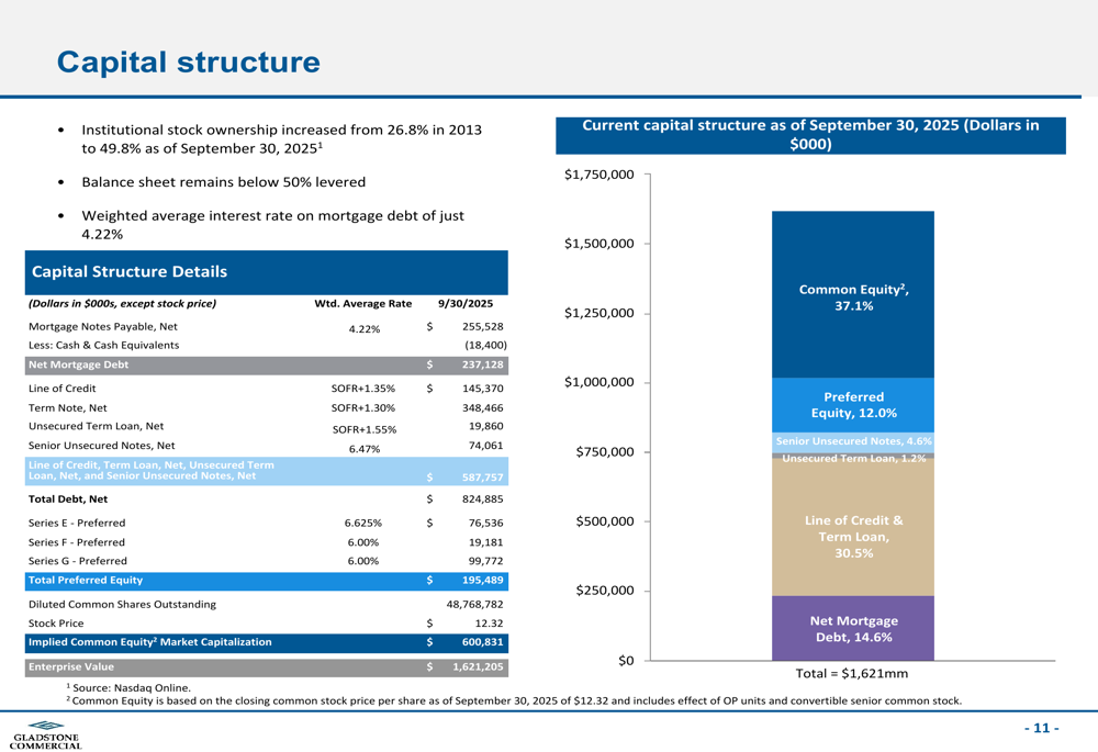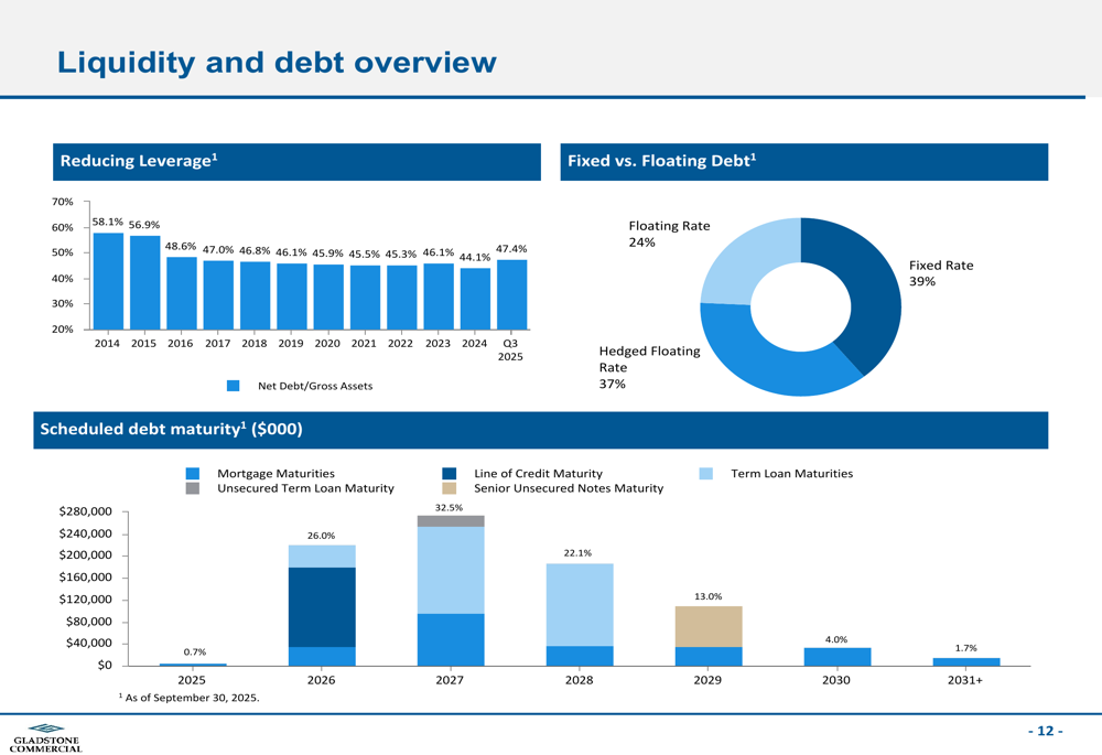 A Gladstone Commercial manteve uma abordagem disciplinada em relação à alavancagem, com sua relação de dívida líquida para ativos brutos em 47,4% no 3º tri de 2025. A estrutura de capital da empresa mostra uma combinação equilibrada de financiamento de dívida e capital próprio, com dívida hipotecária líquida compreendendo 14,6% da capitalização total, linha de crédito e empréstimos a prazo em 30,5%, capital preferencial em 12,0%, e capital ordinário em 37,1%.
