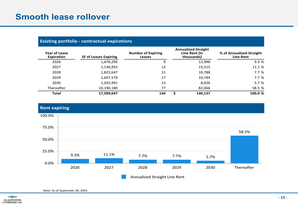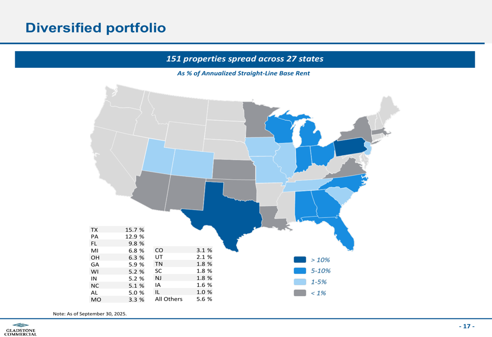 A estratégia de portfólio da Gladstone Commercial continua a enfatizar a diversificação geográfica, tipos de propriedades e setores de inquilinos. A distribuição geográfica mostra concentração em mercados-chave de crescimento, com Texas (15,7%), Pensilvânia (12,9%) e Flórida (9,8%) representando as maiores exposições estaduais.
