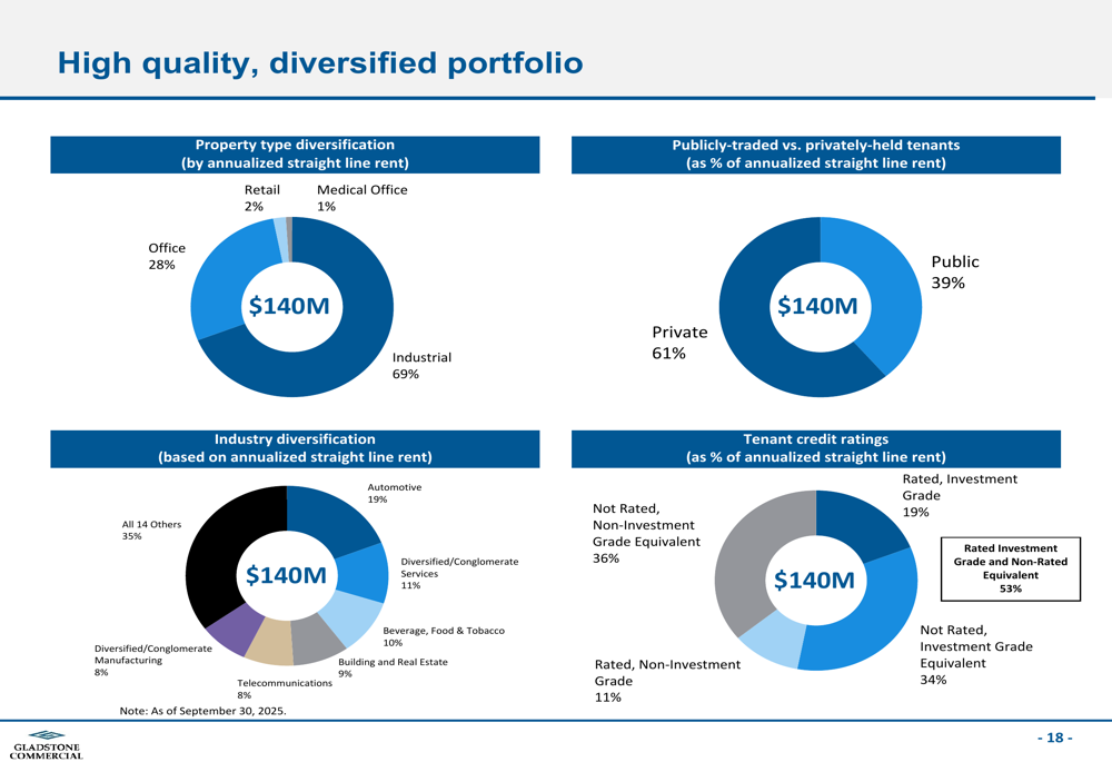 A combinação de tipos de propriedades reflete a mudança estratégica da Gladstone para ativos industriais, que agora representam 69% do portfólio, seguidos por propriedades de escritórios com 28%, com exposição mínima ao varejo (2%) e escritórios médicos (1%). Do ponto de vista setorial, o automotivo representa o maior setor com 19%, seguido por indústrias diversificadas (11%) e bebidas/alimentos (10%).