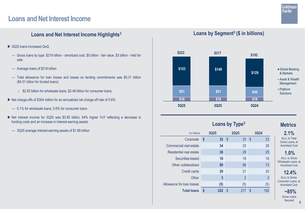 A carteira de empréstimos da Goldman expandiu-se trimestre a trimestre, com receita líquida de juros para o 3º tri de 2025 atingindo US$ 3,85 bilhões, 64% maior que no mesmo período do ano passado. A empresa manteve uma provisão para perdas com empréstimos e arrendamentos (ALLL) em relação ao total de empréstimos brutos ao custo amortizado de 2,1%, com ALLL para empréstimos brutos ao consumidor em 12,4%.