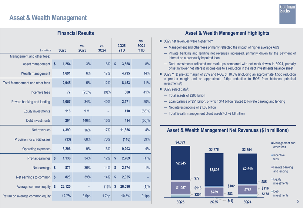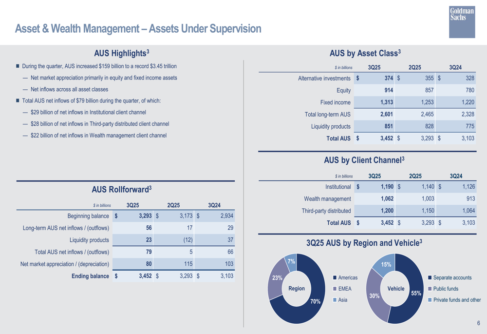 A divisão Asset & Wealth Management alcançou um recorde de Ativos Sob Supervisão (AUS) de US$ 3,45 trilhões, marcando o 31º trimestre consecutivo de entradas líquidas baseadas em taxas de longo prazo. As taxas de gestão e outras taxas atingiram níveis recordes em US$ 2,95 bilhões, refletindo principalmente o impacto do maior AUS médio. As receitas líquidas de private banking e empréstimos também atingiram níveis recordes em US$ 1,06 bilhão.