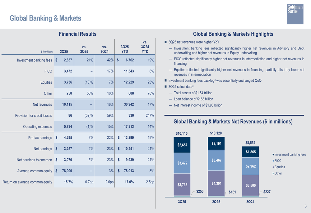 A Goldman Sachs reportou lucro líquido de US$ 4,10 bilhões para o 3º tri de 2025, traduzindo-se em retorno sobre o patrimônio líquido (ROE) de 14,2% e retorno sobre o patrimônio líquido tangível (ROTE) de 15,2%. No acumulado do ano, a empresa gerou US$ 44,83 bilhões em receitas líquidas e US$ 12,56 bilhões em lucro líquido, com valor contábil por ação atingindo US$ 353,79, representando crescimento de 5,1% no acumulado do ano.