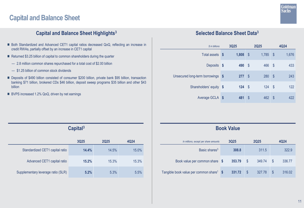 A Goldman Sachs retornou US$ 3,25 bilhões de capital aos acionistas comuns durante o trimestre, demonstrando seu compromisso com o valor para os acionistas. No entanto, os índices de capital CET1 Padronizado e Avançado diminuíram trimestre a trimestre, refletindo a contínua expansão dos negócios e a implantação de capital da empresa.