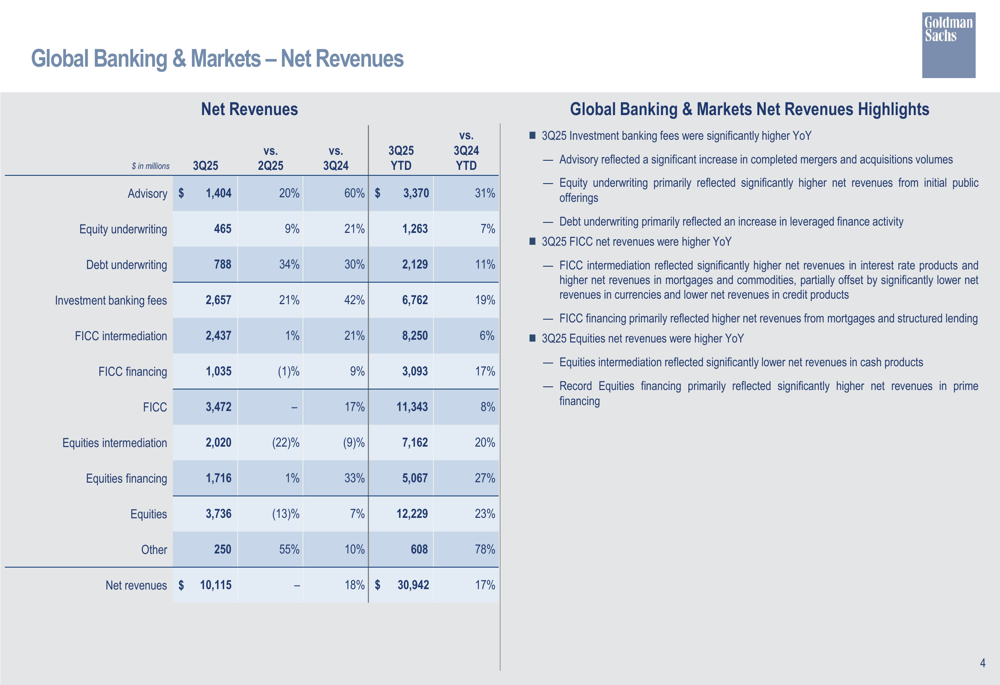 Uma análise mais detalhada dos fluxos de receita da divisão mostra que serviços de Consultoria geraram US$ 1,40 bilhão, subscrição de Ações US$ 465 milhões e subscrição de Dívida US$ 788 milhões. A intermediação FICC contribuiu com US$ 2,44 bilhões, enquanto o financiamento FICC adicionou US$ 1,04 bilhão. Em Ações, a intermediação trouxe US$ 2,02 bilhões, enquanto o financiamento atingiu um recorde de US$ 1,72 bilhão.
