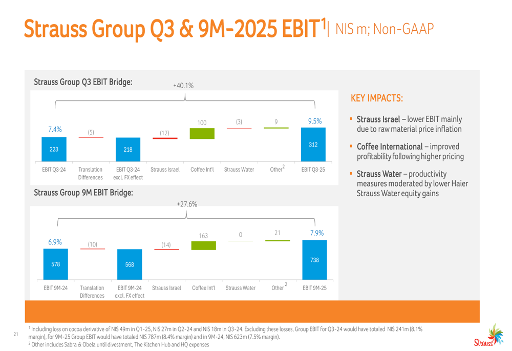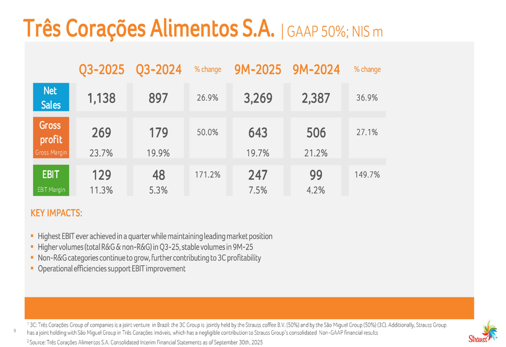 O Grupo Strauss reportou vendas de 3.277 milhões de NIS no 3º tri de 2025, um aumento de 9,6% em relação ao ano anterior (13,2% excluindo o impacto cambial). A empresa alcançou um aumento de 40,1% no EBIT para 312 milhões de NIS e um crescimento de 42,7% no lucro líquido para 146 milhões de NIS.