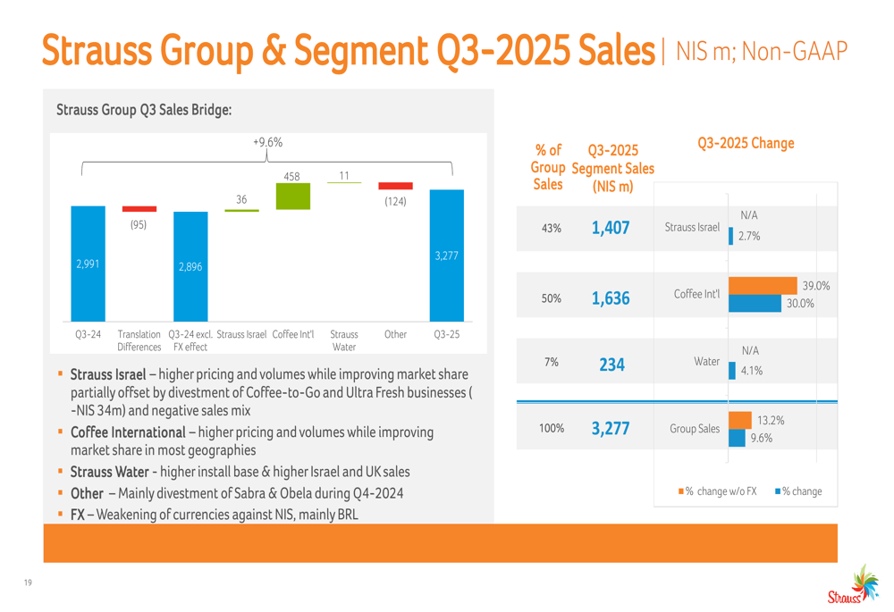 O crescimento das vendas da empresa foi impulsionado principalmente pelo segmento de Café Internacional, que contribuiu com 50% do total de vendas do grupo no 3º tri de 2025, seguido pela Strauss Israel com 43% e Strauss Water com 7%.