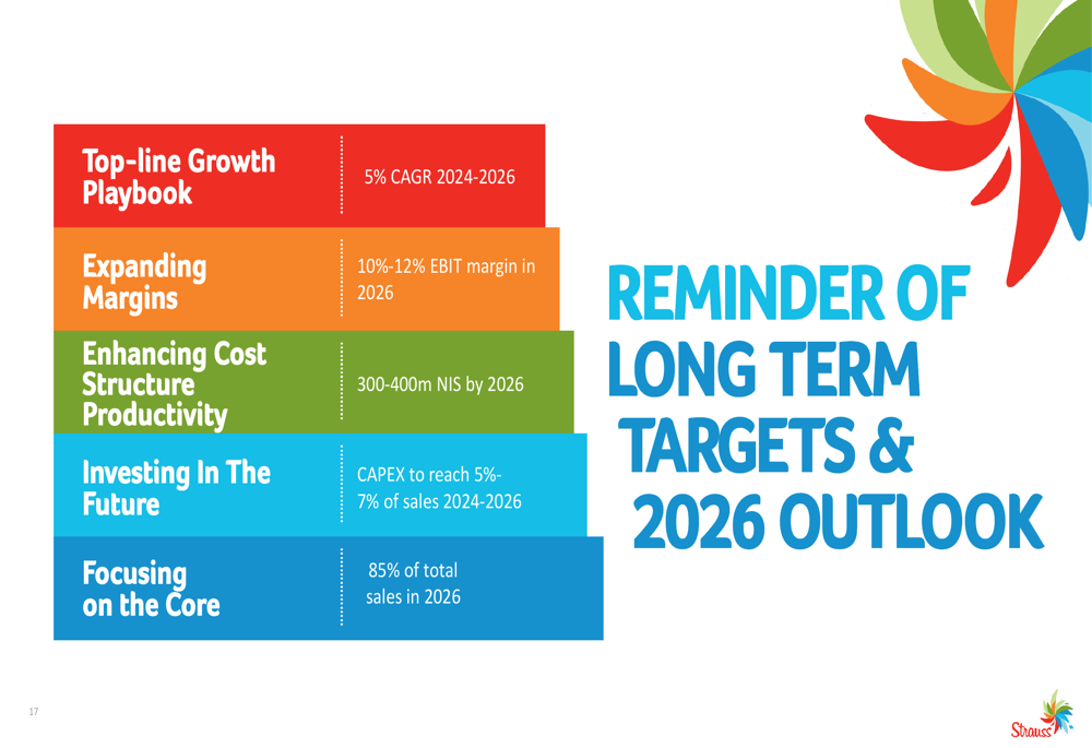 A jornada de produtividade do Grupo Strauss continua no caminho certo para atingir economias de 300-400 milhões de NIS até 2026. A iniciativa concentra-se em quatro pilares estratégicos: Compras Estratégicas, Gestão de Crescimento de Receita e ROI de Marketing, Excelência Operacional, e Desenvolvimento de Capacidades e Mentalidade.