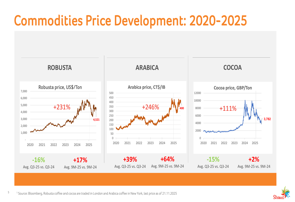 A margem EBIT do Grupo Strauss melhorou para 9,5% no 3º tri de 2025, comparada a 7,4% no mesmo período do ano anterior, refletindo o sucesso das estratégias de precificação e iniciativas de produtividade. No entanto, a margem bruta caiu para 29,3% de 30,5% no 3º tri de 2024, principalmente devido aos custos mais altos de matérias-primas, particularmente o cacau.